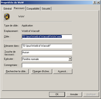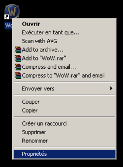• Déplacez le répertoire CharacterProfiler dans le répertoire \Interface\Addons de WoW, par exemple pour moi c'est D:\jeux\World of Warcraft\Interface\AddOns. Pour déterminer cet emplacement vous pouvez effectuer un clic-droit → Propriétés sur votre raccourci WoW :
